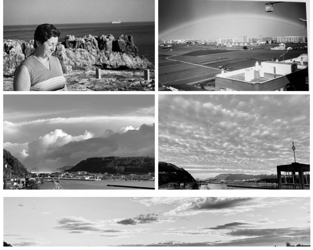 Pies de foto (de izquierda a derecha, de arriba abajo). Mi madre en 1985. Foto de un arcoíris desde nuestra casa de infancia y adolescencia, antes de que se construyeran el parque de Orriols y las decenas de residenciales que acabaron con todas esas huertas. Algunas de las fotos de cielos compartidos entre Eva y Flor.