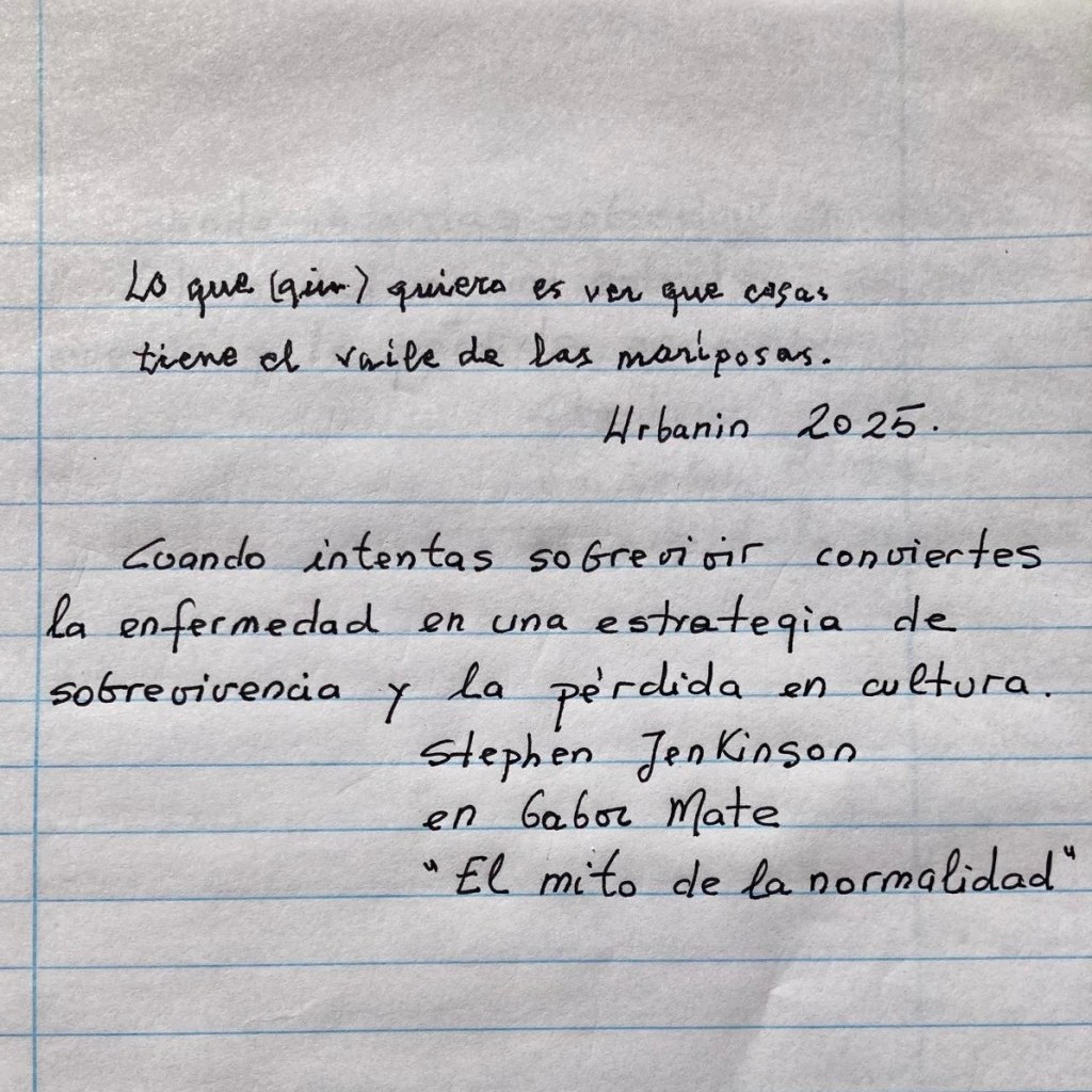 El otro día también papá volvió a escribir justo esta frase «Lo que quiero es ver qué cosas/tiene el baile de las mariposas». Le grabé un video haciéndolo, la letra le ha mejorado mucho en la resi, desde que entró que apenas pudo firmar el contrato. Es importante porque deteniéndome en su caligrafía me doy cuenta de que papá supo defender a una persona que producía esa letra preciosa en todos sus escritos. Seguramente necesitó más que yo ¡la buena letra! En su generación es cierto fue una virtud. Y ahora con su parkinson desatado la está procurando recuperar. Esa letra y todo lo demás porque quiere salir de allí, aunque aún no, cuando sea menos cara. Y yo me estoy reconciliando con él, porque el viejito enrollado y despótico con el harén de hijas y cuidadoras a su servicio, le dejaba en una posición infame. Bendita caída, bendita residencia y bendita vida. Enfermamos para sobrevivir. Me ha costado entenderlo pero es así, ¡para que la vida triunfe de otra forma, cumpliendo con otras funciones!